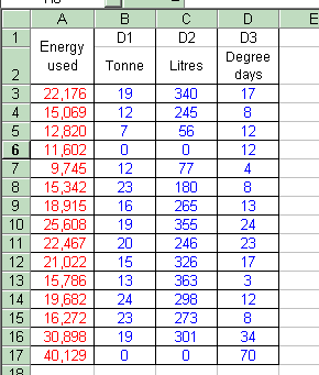 In the spreadsheet program's regression analysis tool, the column of consumption figures (shown in red) are the 'dependent variable' or 'y range'. The block of figures in blue represents the 'independent variables' or 'x range'. The x range may span several columns, as shown here, but it would be a single column if there were only one driving factor.