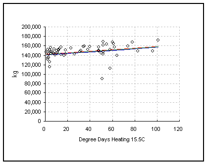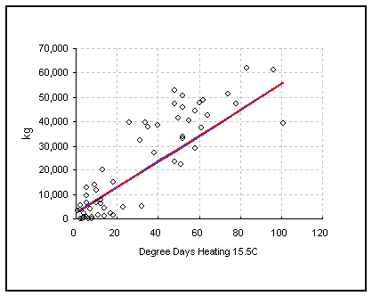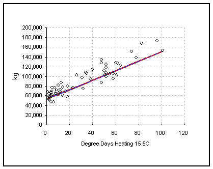 higher intercept on the y axis, than might be expected. This suggests that too much heat is being delivered in mild weather (low degree-day values). Such behaviour may suggest inadequate control, excessive standing